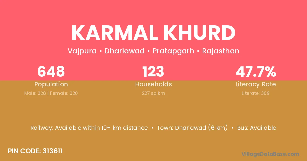 Dhariawad (6 km) is the nearest town to Karmal Khurd village for major economic activities and is located approximately 6 km away.