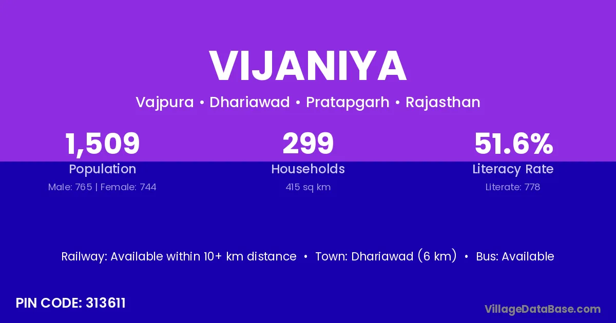 Dhariawad (6 km) is the nearest town to Vijaniya village for major economic activities and is located approximately 6 km away.