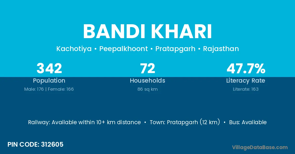 Pratapgarh (12 km) is the nearest town to Bandi Khari village for major economic activities and is located approximately 12 km away.