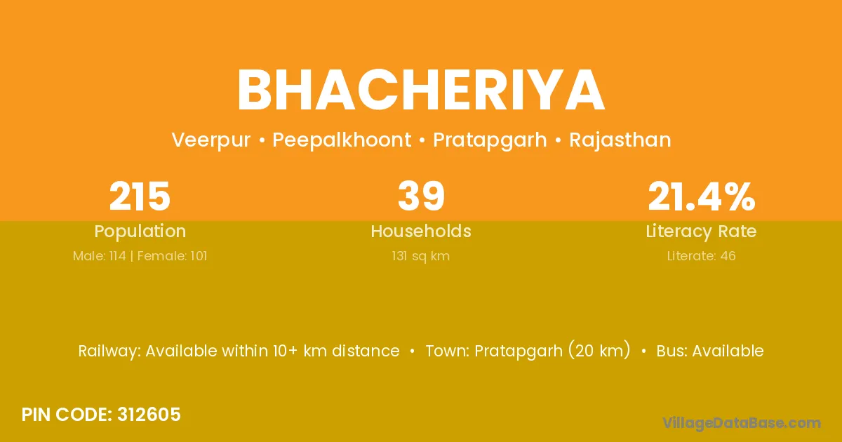 Pratapgarh (20 km) is the nearest town to Bhacheriya village for major economic activities and is located approximately 20 km away.
