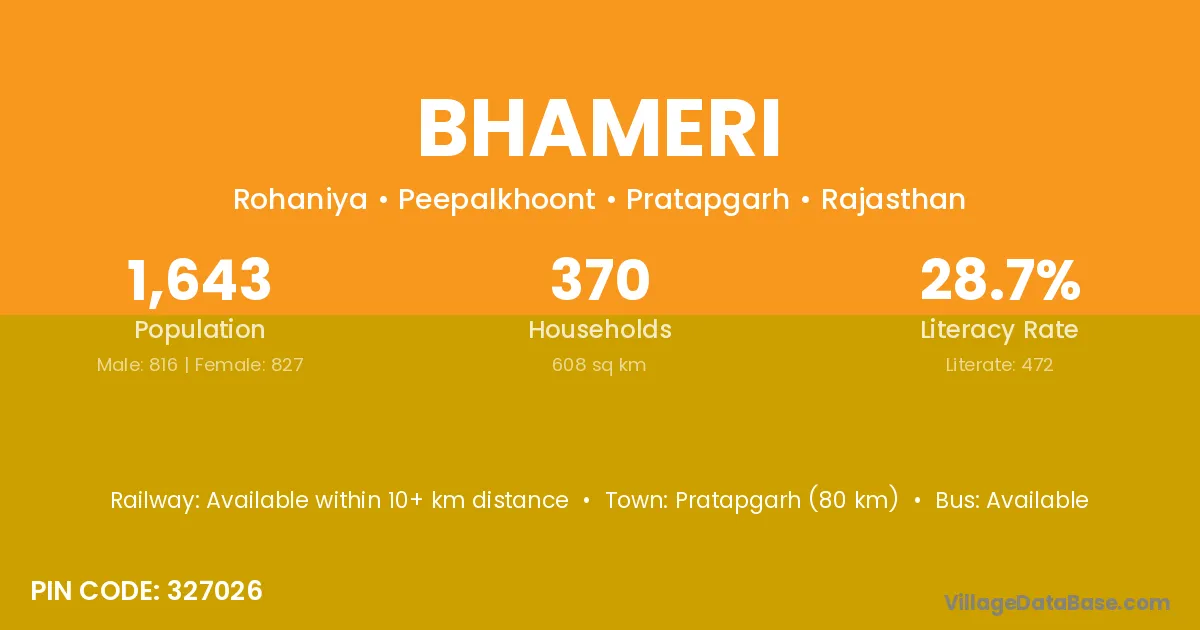 Pratapgarh (80 km) is the nearest town to Bhameri village for major economic activities and is located approximately 80 km away.