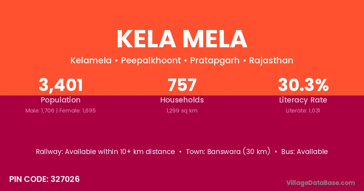 Banswara (30 km) is the nearest town to Kela Mela village for major economic activities and is located approximately 30 km away.