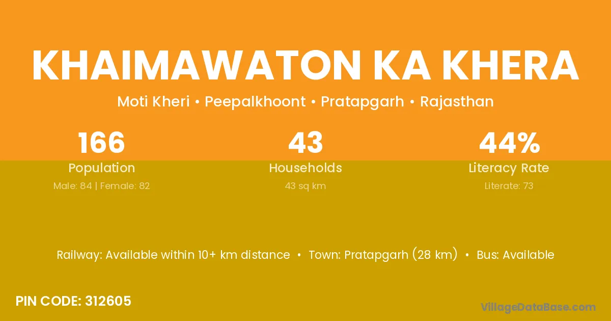 Pratapgarh (28 km) is the nearest town to Khaimawaton Ka Khera village for major economic activities and is located approximately 28 km away.