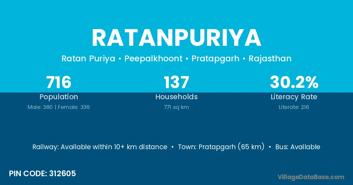 Pratapgarh (65 km) is the nearest town to Ratanpuriya village for major economic activities and is located approximately 65 km away.