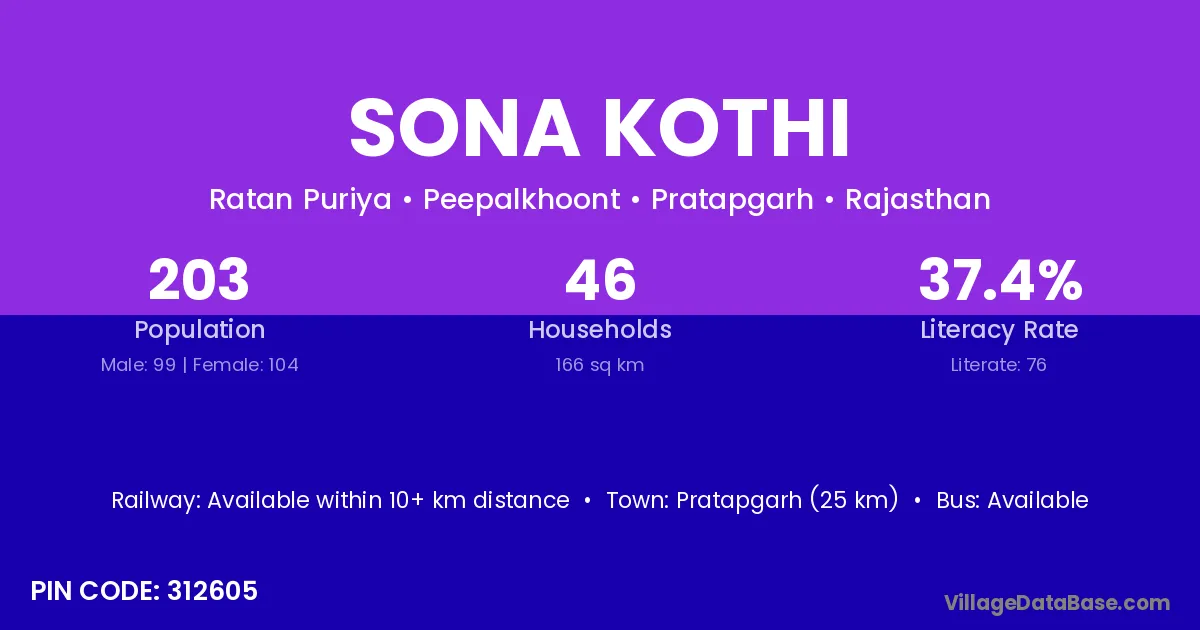 Pratapgarh (25 km) is the nearest town to Sona Kothi village for major economic activities and is located approximately 25 km away.