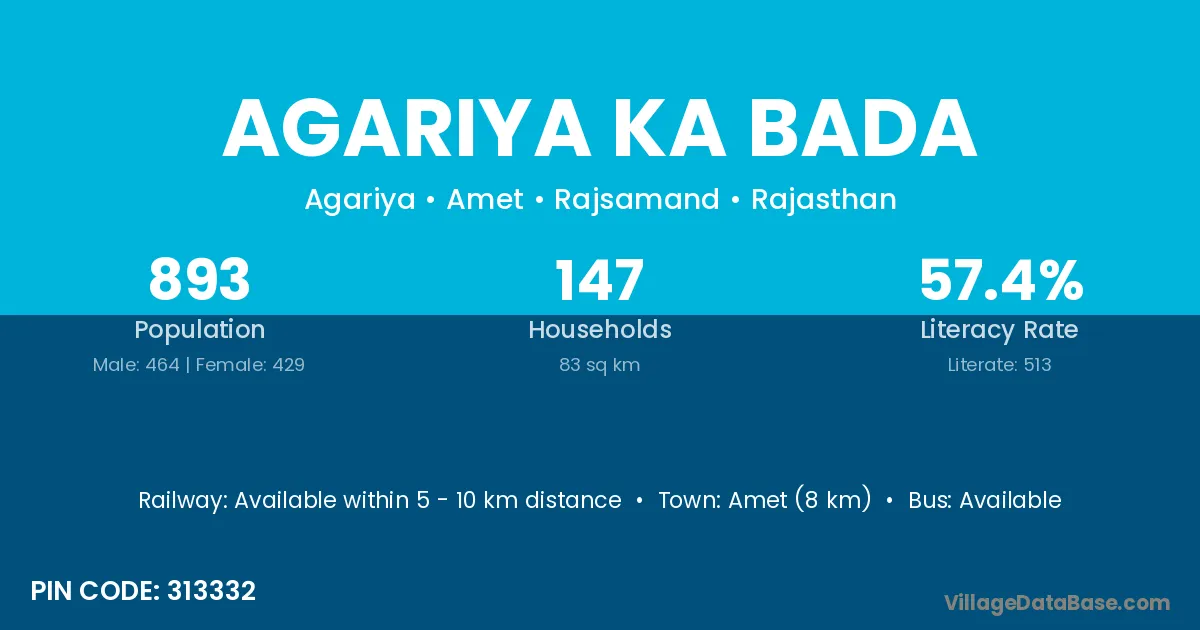 Amet (8 km) is the nearest town to Agariya Ka Bada village for major economic activities and is located approximately 8 km away.