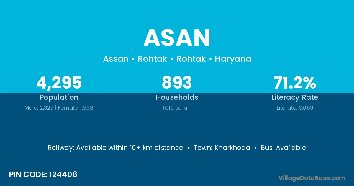 The literacy rate of Asan village is 56.45%. Male literacy stands at 71.12% and female literacy at 41.62%.
