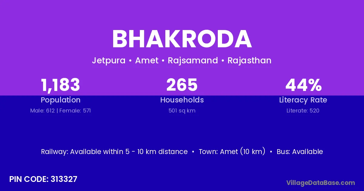 Amet (10 km) is the nearest town to Bhakroda village for major economic activities and is located approximately 10 km away.