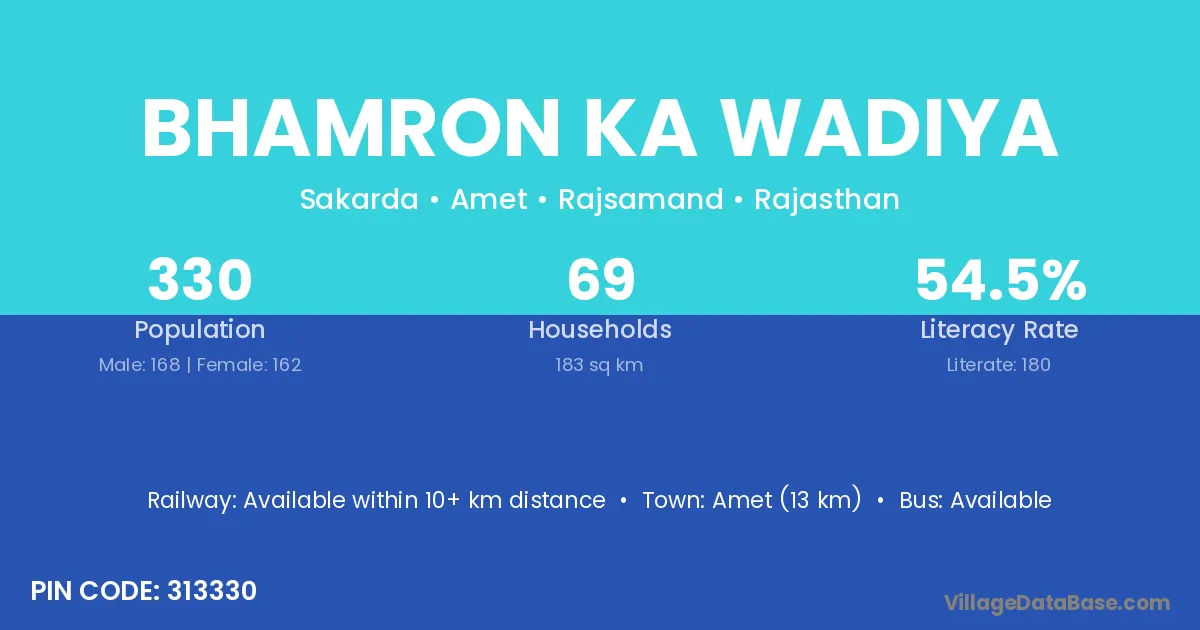 Bhamron Ka Wadiya village has a total population of 330 people, of which 168 are males and 162 are females.