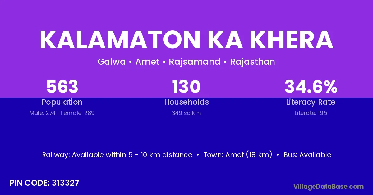 Amet (18 km) is the nearest town to Kalamaton Ka Khera village for major economic activities and is located approximately 18 km away.