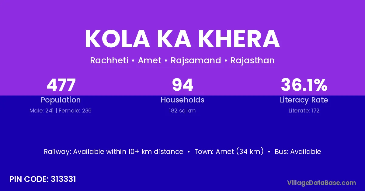 Amet (34 km) is the nearest town to Kola Ka Khera village for major economic activities and is located approximately 34 km away.