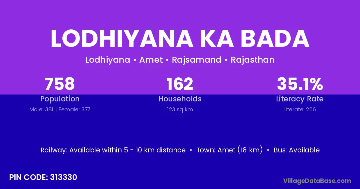 Lodhiyana Ka Bada village has a total population of 758 people, of which 381 are males and 377 are females.
