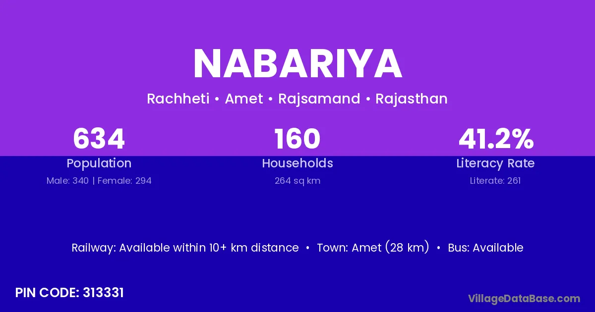 Amet (28 km) is the nearest town to Nabariya village for major economic activities and is located approximately 28 km away.
