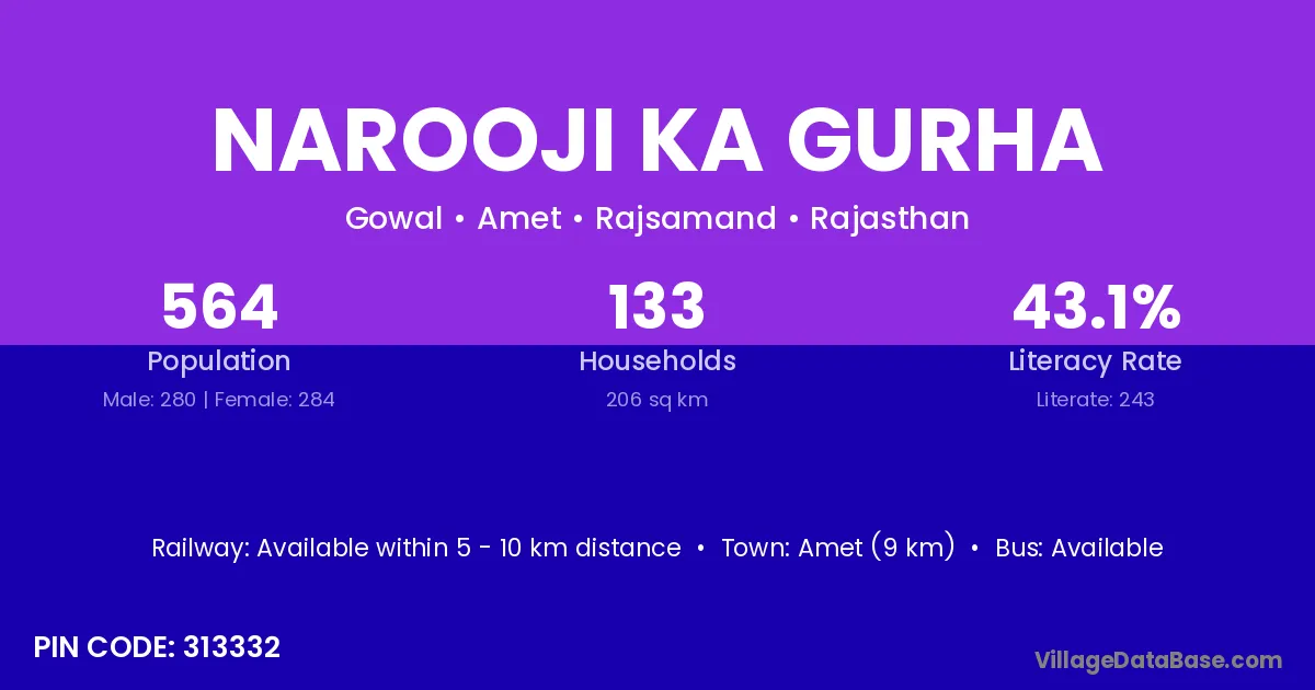 Narooji Ka Gurha village has a total population of 564 people, of which 280 are males and 284 are females.