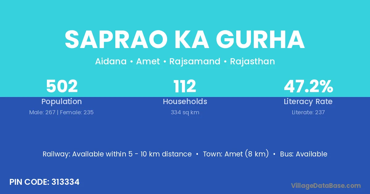 Saprao Ka Gurha village has a total population of 502 people, of which 267 are males and 235 are females.