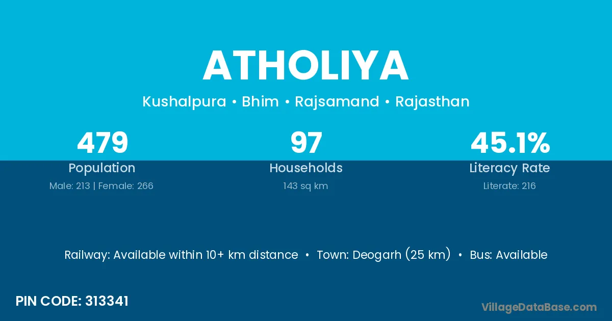Deogarh (25 km) is the nearest town to Atholiya village for major economic activities and is located approximately 25 km away.