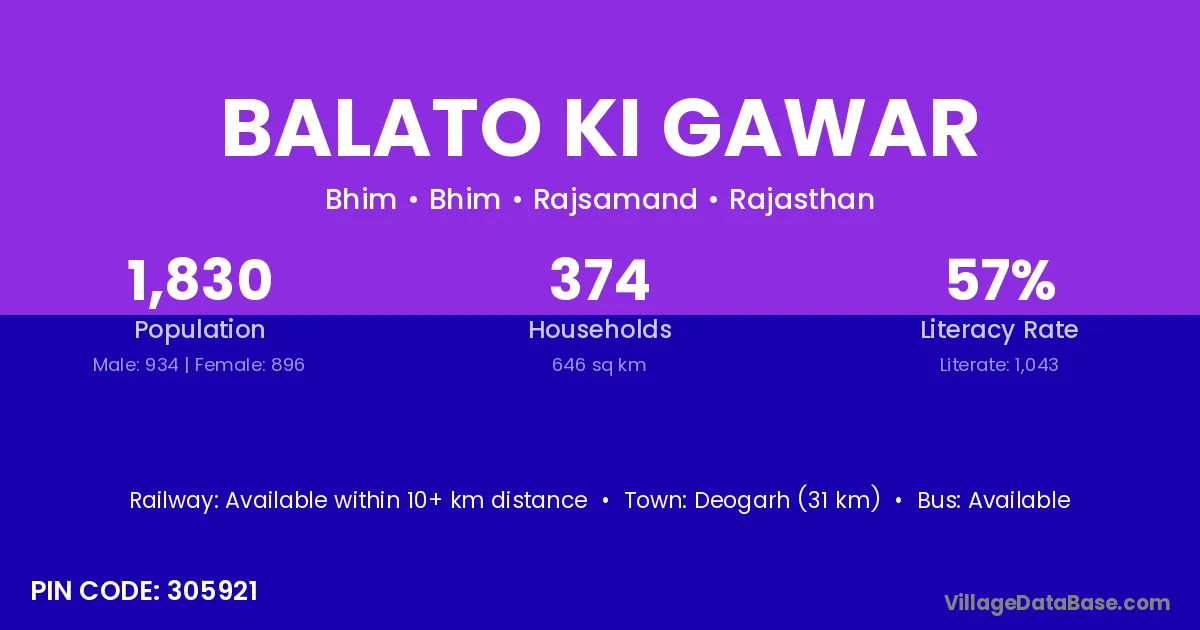 Balato Ki Gawar village has a total population of 1,830 people, of which 934 are males and 896 are females.