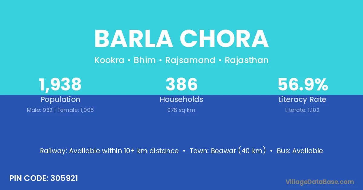 Beawar (40 km) is the nearest town to Barla Chora village for major economic activities and is located approximately 40 km away.