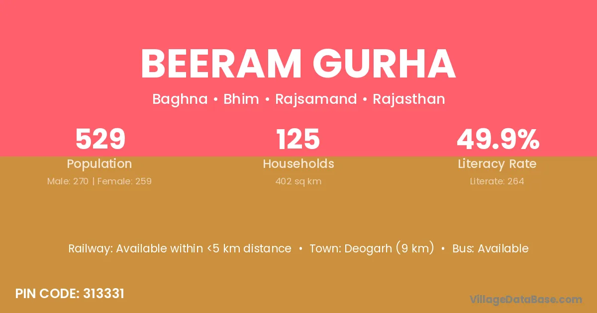 Deogarh (9 km) is the nearest town to Beeram Gurha village for major economic activities and is located approximately 9 km away.