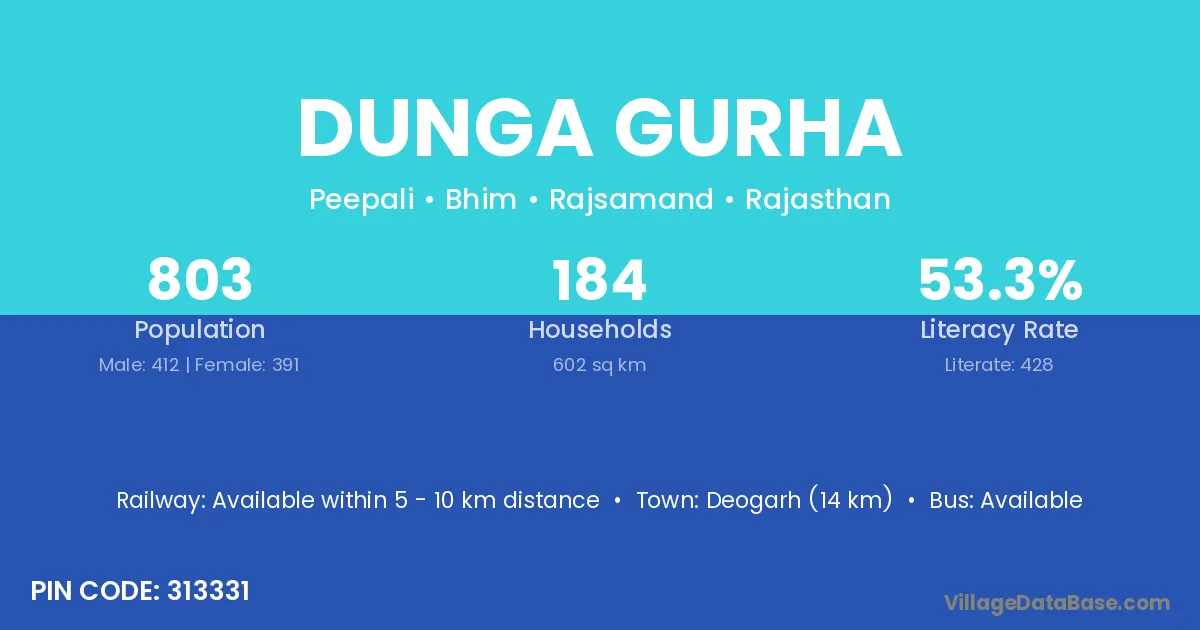 Deogarh (14 km) is the nearest town to Dunga Gurha village for major economic activities and is located approximately 14 km away.