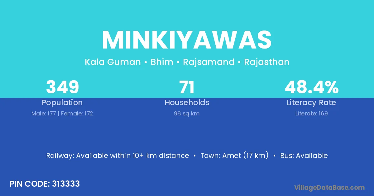 Amet (17 km) is the nearest town to Minkiyawas village for major economic activities and is located approximately 17 km away.