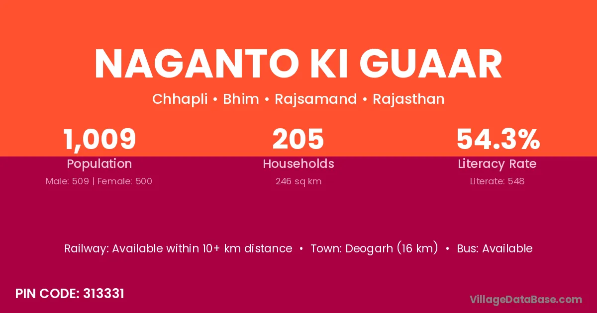 Deogarh (16 km) is the nearest town to Naganto Ki Guaar village for major economic activities and is located approximately 16 km away.