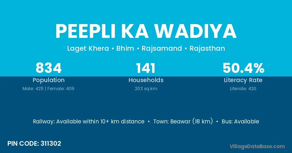 Beawar (18 km) is the nearest town to Peepli Ka Wadiya village for major economic activities and is located approximately 18 km away.