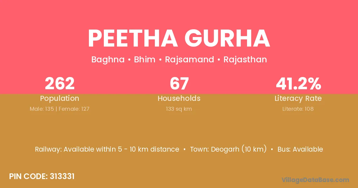 Peetha Gurha village has a total population of 262 people, of which 135 are males and 127 are females.