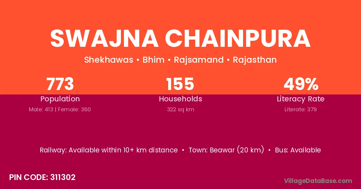 Beawar (20 km) is the nearest town to Swajna Chainpura village for major economic activities and is located approximately 20 km away.