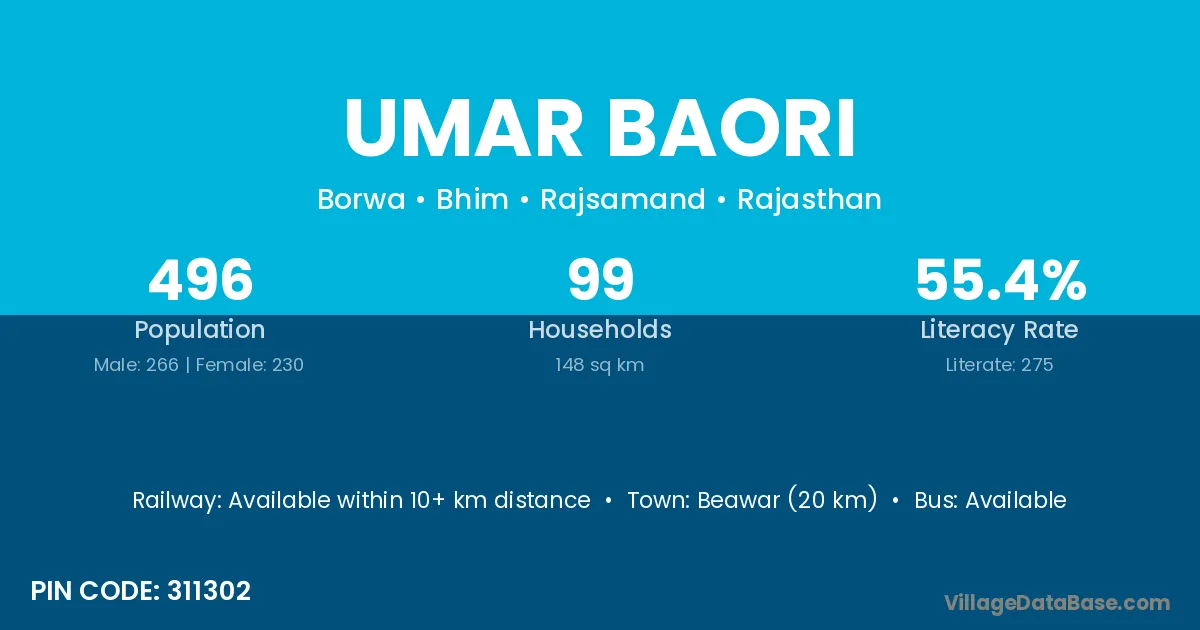 Beawar (20 km) is the nearest town to Umar Baori village for major economic activities and is located approximately 20 km away.