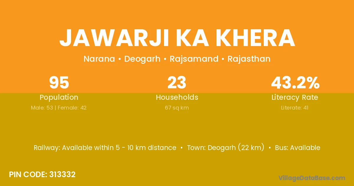 Deogarh (22 km) is the nearest town to Jawarji Ka Khera village for major economic activities and is located approximately 22 km away.