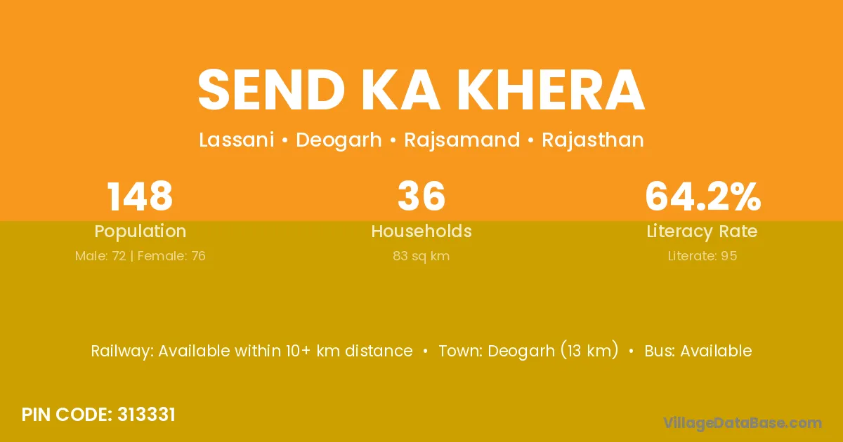 Deogarh (13 km) is the nearest town to Send Ka Khera village for major economic activities and is located approximately 13 km away.