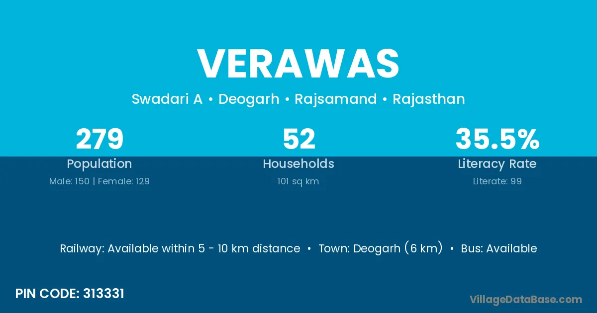 Deogarh (6 km) is the nearest town to Verawas village for major economic activities and is located approximately 6 km away.