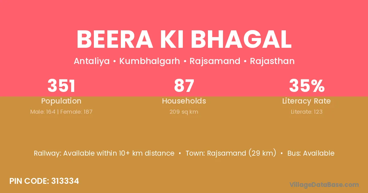 Beera Ki Bhagal village has a total population of 351 people, of which 164 are males and 187 are females.