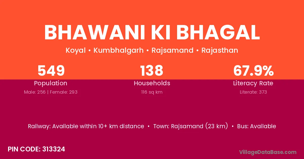 Bhawani Ki Bhagal village has a total population of 549 people, of which 256 are males and 293 are females.