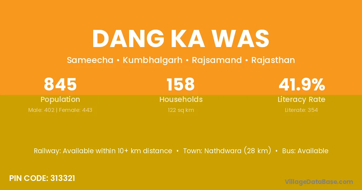 Nathdwara (28 km) is the nearest town to Dang Ka Was village for major economic activities and is located approximately 28 km away.