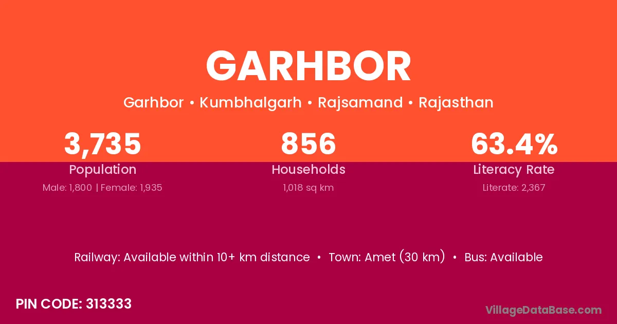 Amet (30 km) is the nearest town to Garhbor village for major economic activities and is located approximately 30 km away.