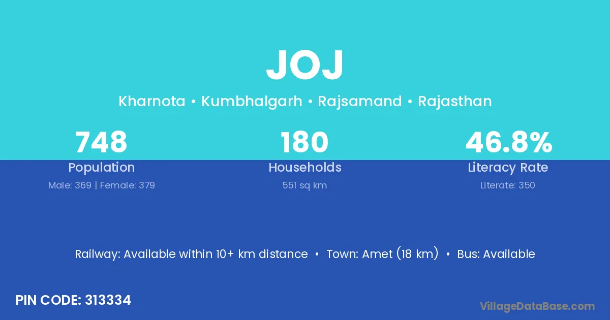 Amet (18 km) is the nearest town to Joj village for major economic activities and is located approximately 18 km away.