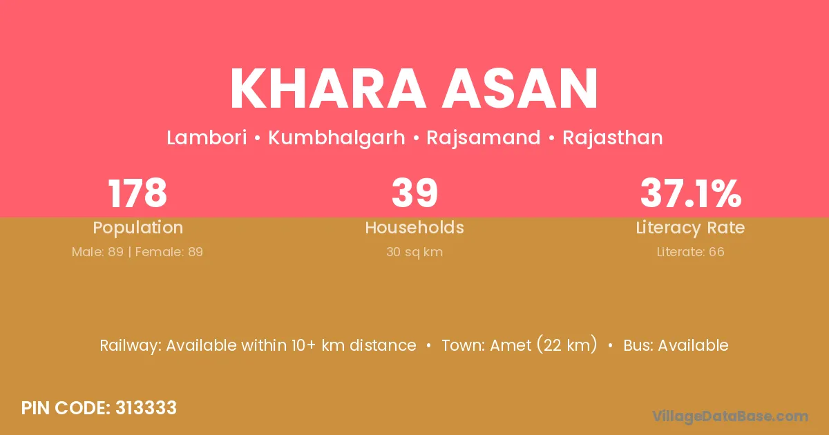 Amet (22 km) is the nearest town to Khara Asan village for major economic activities and is located approximately 22 km away.