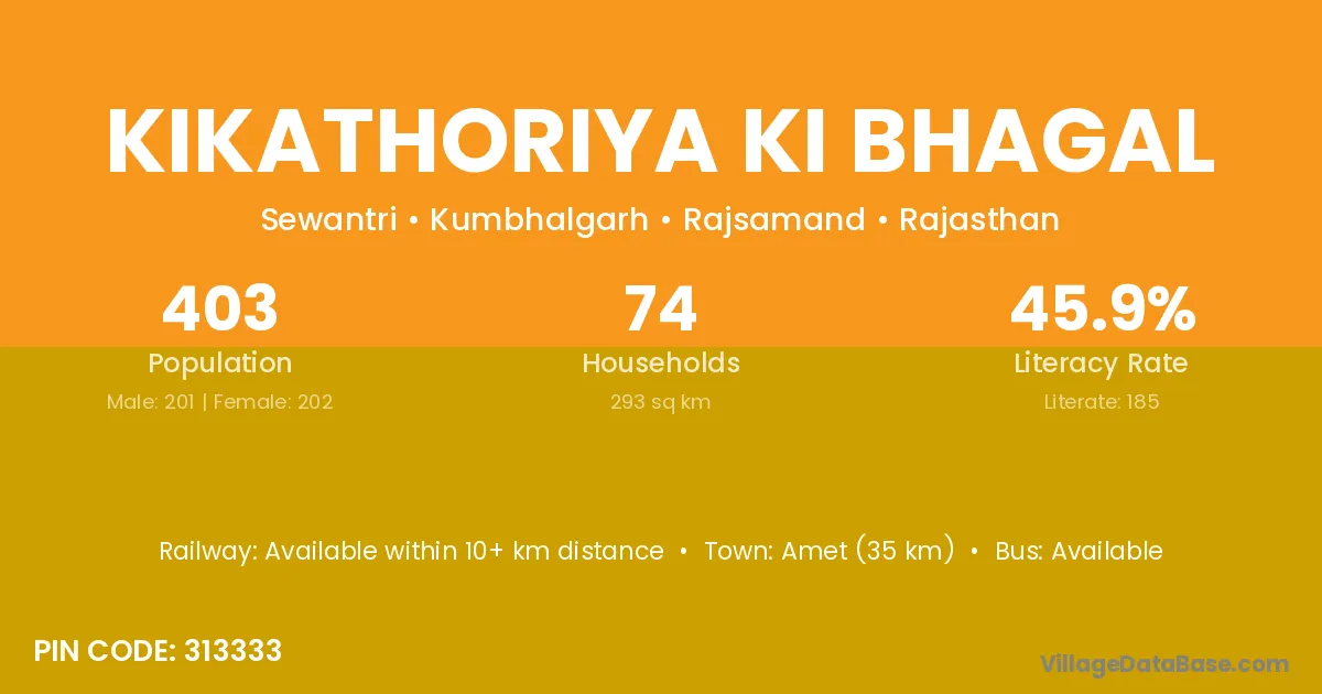 Amet (35 km) is the nearest town to Kikathoriya Ki Bhagal village for major economic activities and is located approximately 35 km away.