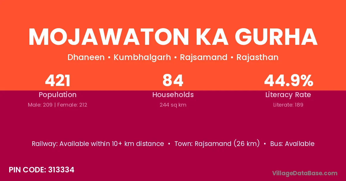 Mojawaton Ka Gurha village has a total population of 421 people, of which 209 are males and 212 are females.