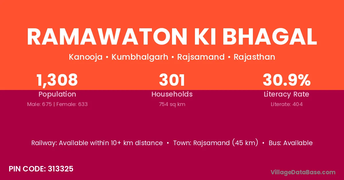 Ramawaton Ki Bhagal village has a total population of 1,308 people, of which 675 are males and 633 are females.