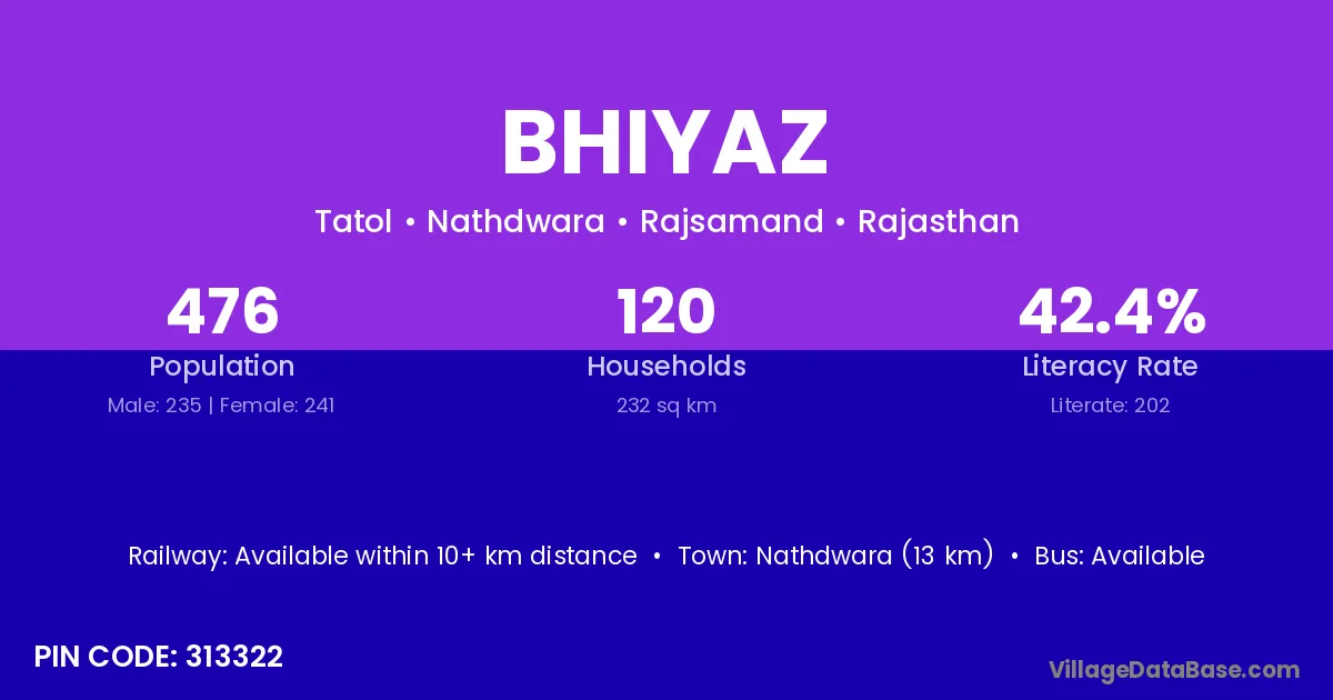 Nathdwara (13 km) is the nearest town to Bhiyaz village for major economic activities and is located approximately 13 km away.