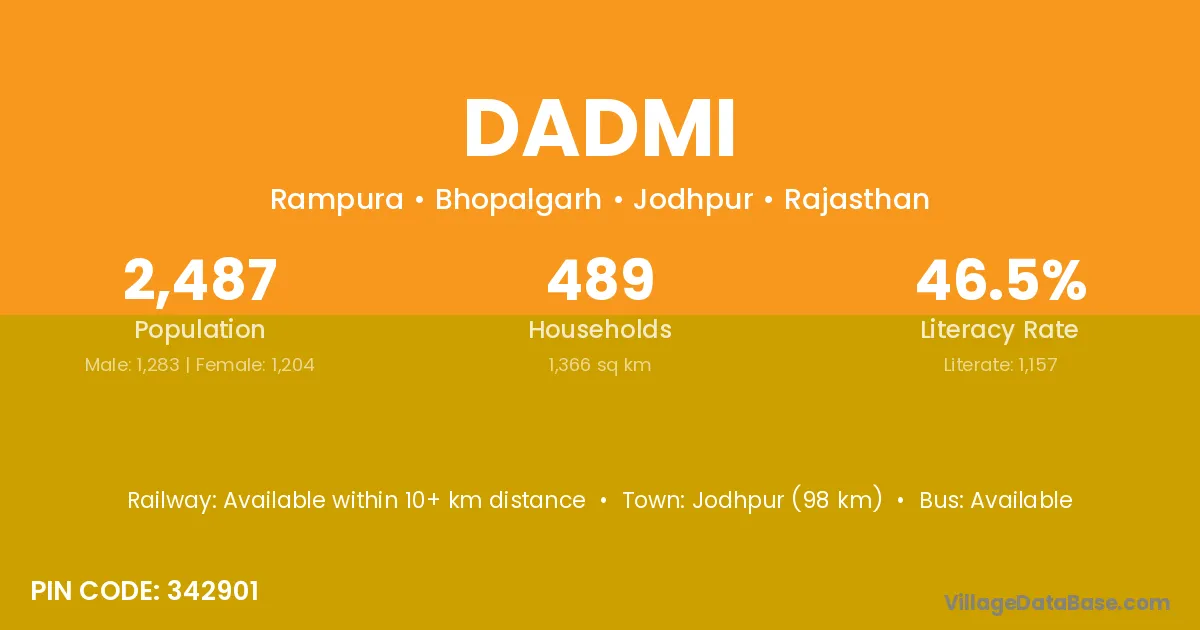 Nathdwara (20 km) is the nearest town to Dadmi village for major economic activities and is located approximately 20 km away.