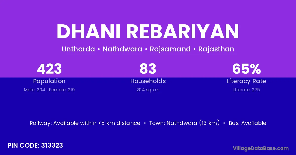 Nathdwara (13 km) is the nearest town to Dhani Rebariyan village for major economic activities and is located approximately 13 km away.