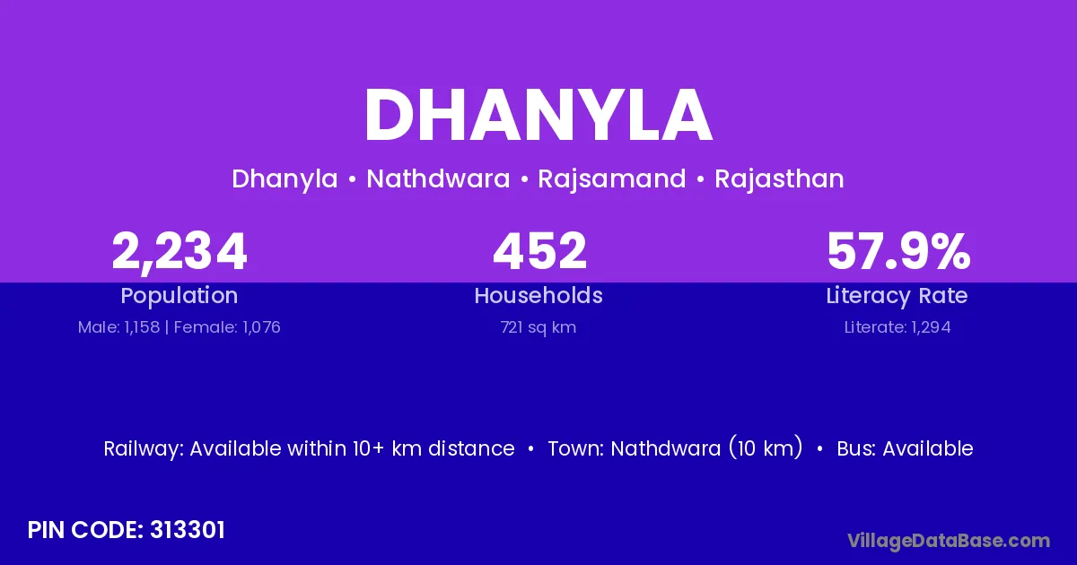 Nathdwara (10 km) is the nearest town to Dhanyla village for major economic activities and is located approximately 10 km away.