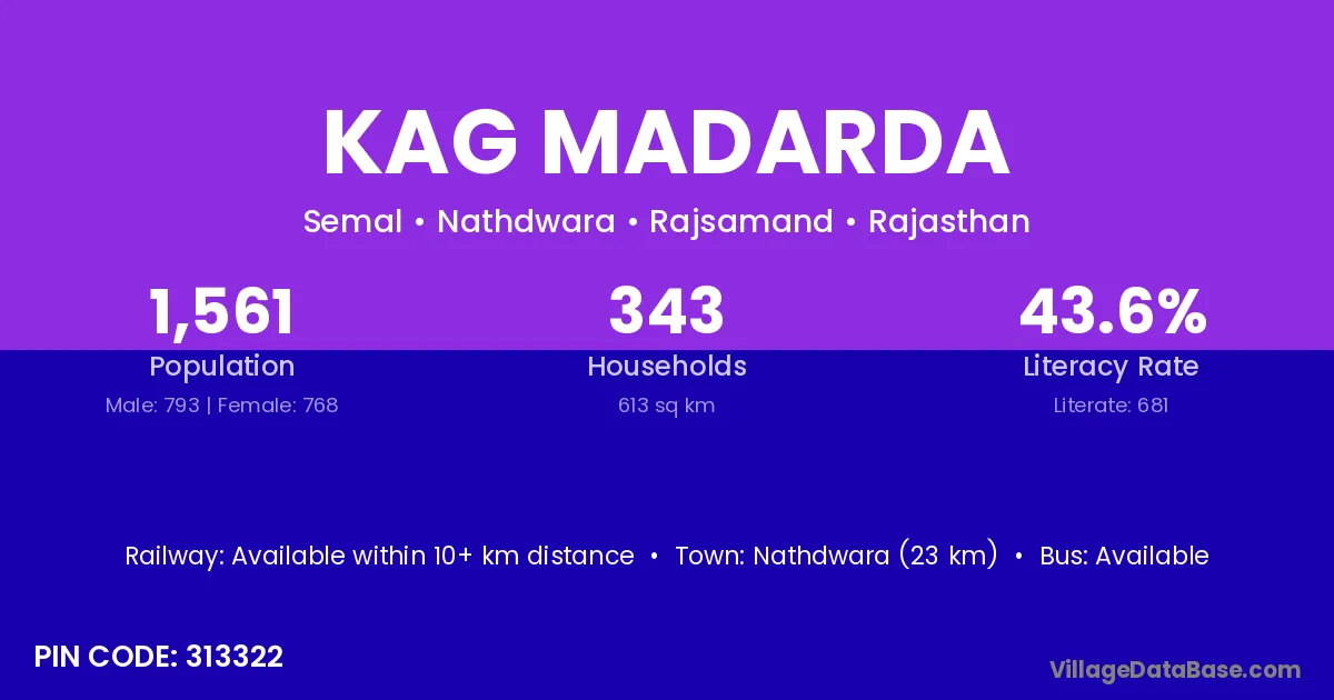 Nathdwara (23 km) is the nearest town to Kag Madarda village for major economic activities and is located approximately 23 km away.