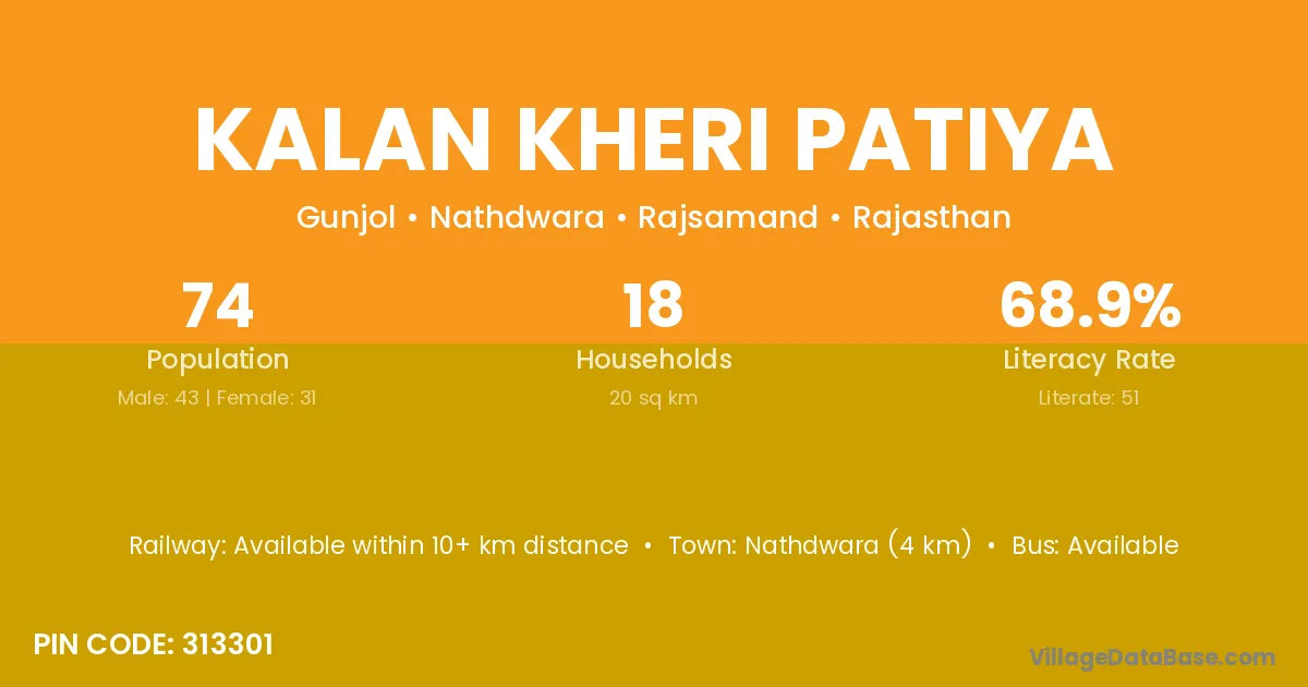 Nathdwara (4 km) is the nearest town to Kalan Kheri Patiya village for major economic activities and is located approximately 4 km away.