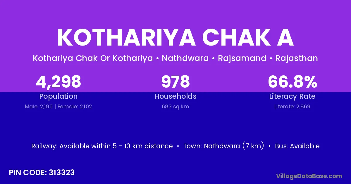 Nathdwara (7 km) is the nearest town to Kothariya Chak A village for major economic activities and is located approximately 7 km away.