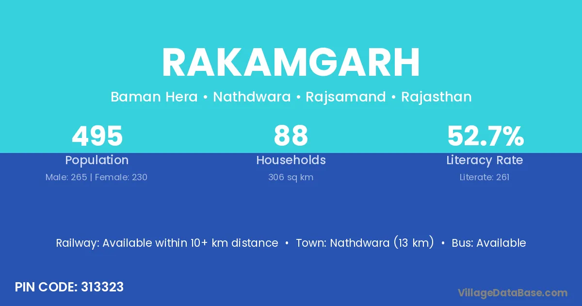 Nathdwara (13 km) is the nearest town to Rakamgarh village for major economic activities and is located approximately 13 km away.